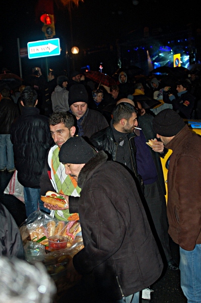 Ayşegül Aydın / Televizyon kanalları yağmurdan korunmak için otobüs duraklarına sığınmıştı. Su, sandviç ve şemsiye satanlar satmaya çalışanlar vardı. İçeri alkol sokulmadığından isteyenler bariyerlerin dışında hem içtiler hem de konseri dinlediler.