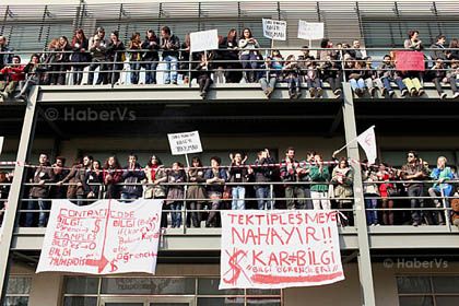Eylem, geçtiğimiz hafta görevine son verilen üç akademisyenin de ofislerinin bulunduğu ve güvenlik gerekçesiyle 9 Ocak Pazar, bir günlüğüne kapatılan E1 binasının önünde devam etti. Yaklaşık iki saat süren eylem, katılımcıların bu binayı sembolik olarak ablukaya almasıyla sona erdi.