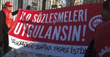 Devrimci İşçi Sendikaları Konfederasyonu DİSK üyesi sendikacılar Uluslararası Çalışma Örgütü (ILO) Türkiye temsilciliği ofisinde ve önünde oturma eylemi başlattı.