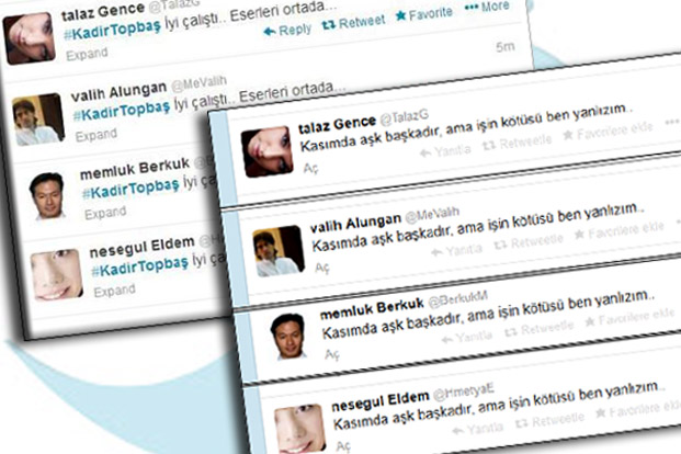 Örneğin aynı dakikada “#KadirTopbaş İyi çalıştı.. Eserleri ortada..” yazan yazir Caymaz (@YazirC), yavuzhan Erden (@n_erden), Hadiye Anat (@AnatKaa) ve mukremin Albatu (@IAlbatu) kullanıcı ismine sahip hesaplar 9 Kasım’da aktif hale gelmiş.