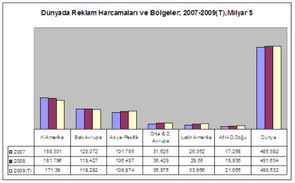 Tahminler, reklamda daralmanın en çok Kuzey Amerika’da yaşanacağını ve pazardaki payı yüzde 36’yı bulan Amerika’da 2009 daralmasının yüzde 6’ya yaklaşacağını ortaya koyuyor. Reklamlardaki payı dörtte biri bulan diğer Merkez ülkelerin toplandığı Batı Avrupa’da da 2009 daralması yüzde 1 olarak öngörülüyor. (Tablo-1)