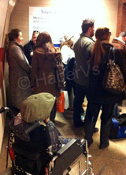 Fotoğrafta en arkada görünen Alev, metronun Taksim istasyonunda “öncelikle engelli, yaşlı ve çocuklar” için ayrılmış asansörün önünde “sırasını” bekliyor. Ancak asansörün önünde bekleyenler ne giriş kapısında yazan uyarının ne de arkalarında bekleyen gerçek ihtiyaç sahibinin farkında değil. Alev asansörü kullanma önceliği konusunda uyarıyor bu insanları: